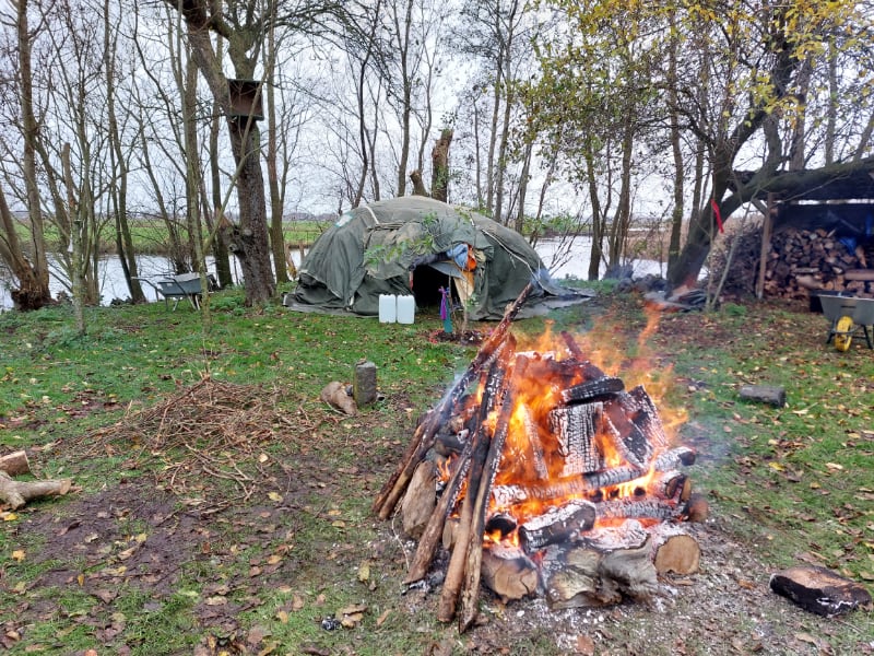 Na aankomst is er een kennismakingsronde rond de vuurplek, waarbij de taken worden verdeeld voor het opbouwen van de hut met dekens en het halen van hout voor de vuurvrouw of vuurman.